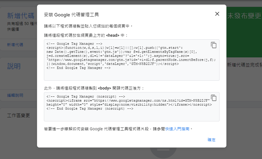 - 將 GTM 提供的程式碼貼到網站原始碼中,請依上面指示貼,這樣就完成安裝 GTM了。