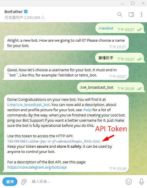 3. 成功建立後,BotFather 會提供一組 API Token,請妥善保存